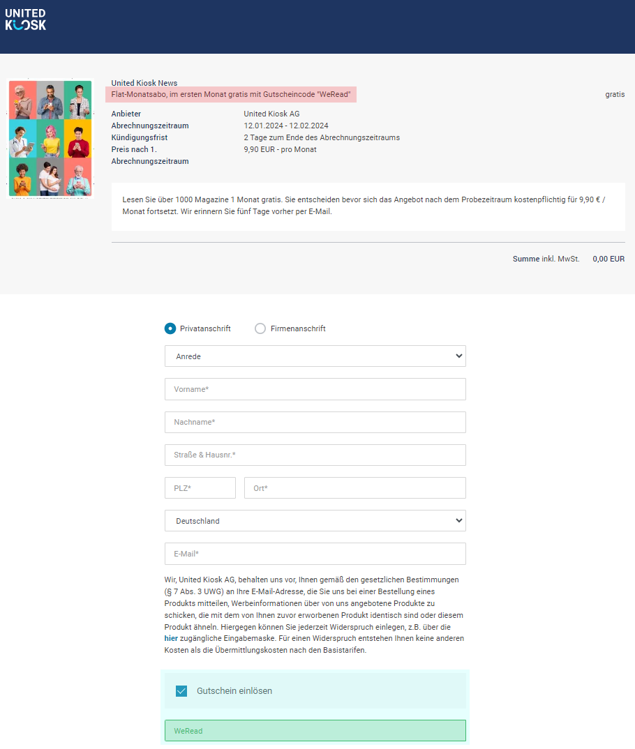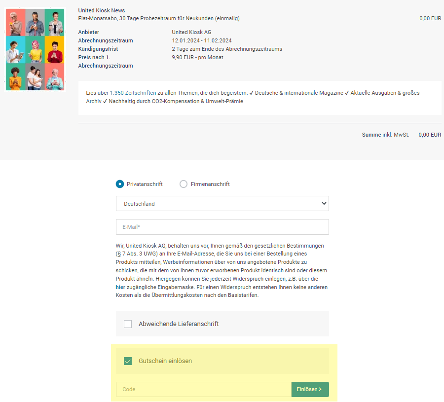 Auf united-kiosk.de können Sie Gutscheine direkt im Bestellprozess des entsprechenden Angebots einlösen (gelbe Markierung auf dem folgenden Bild). Sobald Sie einen gültigen Gutschein- oder Rabattcode eingegeben haben, ändert sich der im Kaufprozess angezeigte Preis entsprechend.
